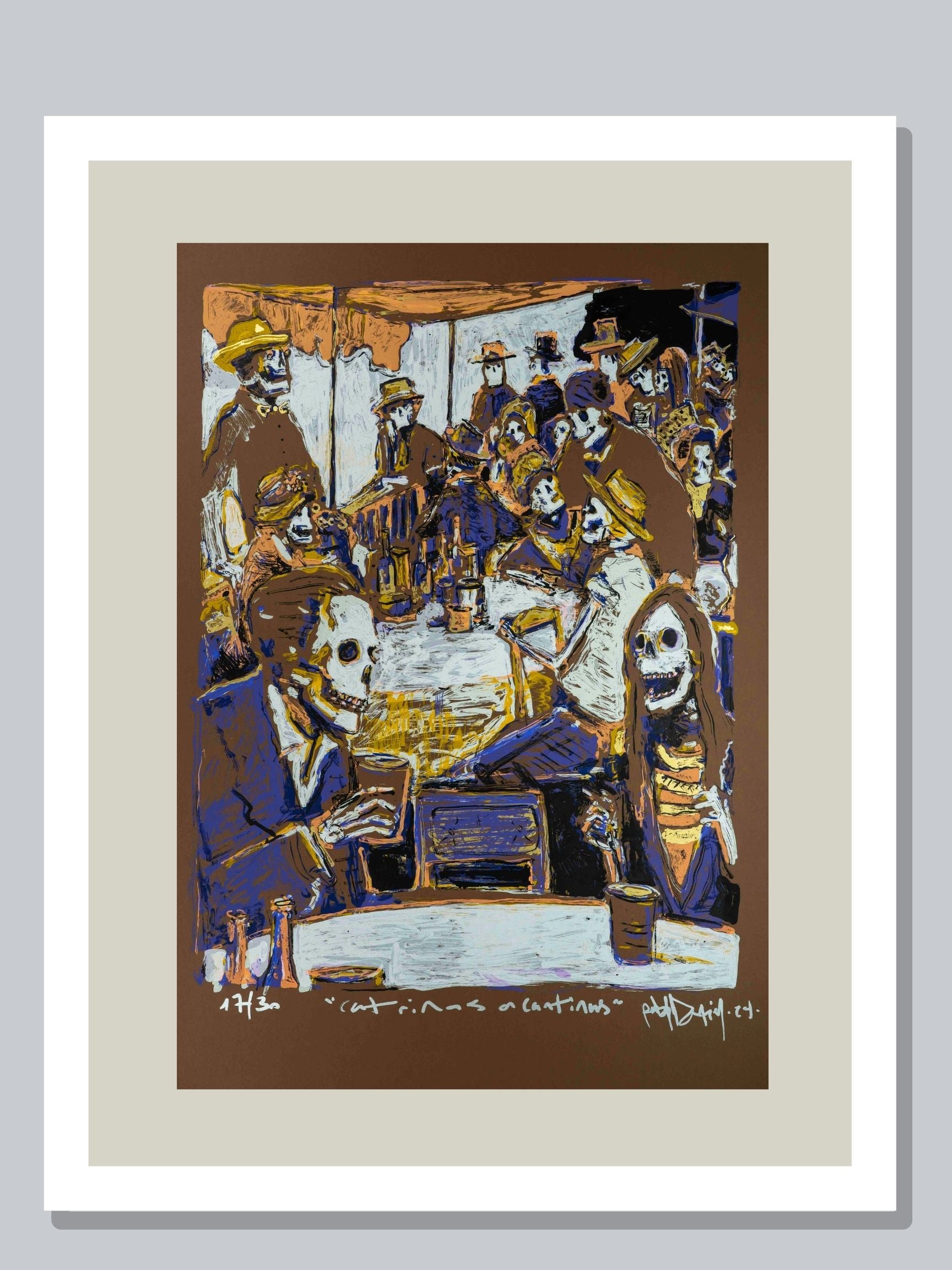 This unique work by Pablo Arteaga, titled "Catrinas in Cantinas," was created using the serigraphy technique. Its dimensions are 70 x 50 cm.