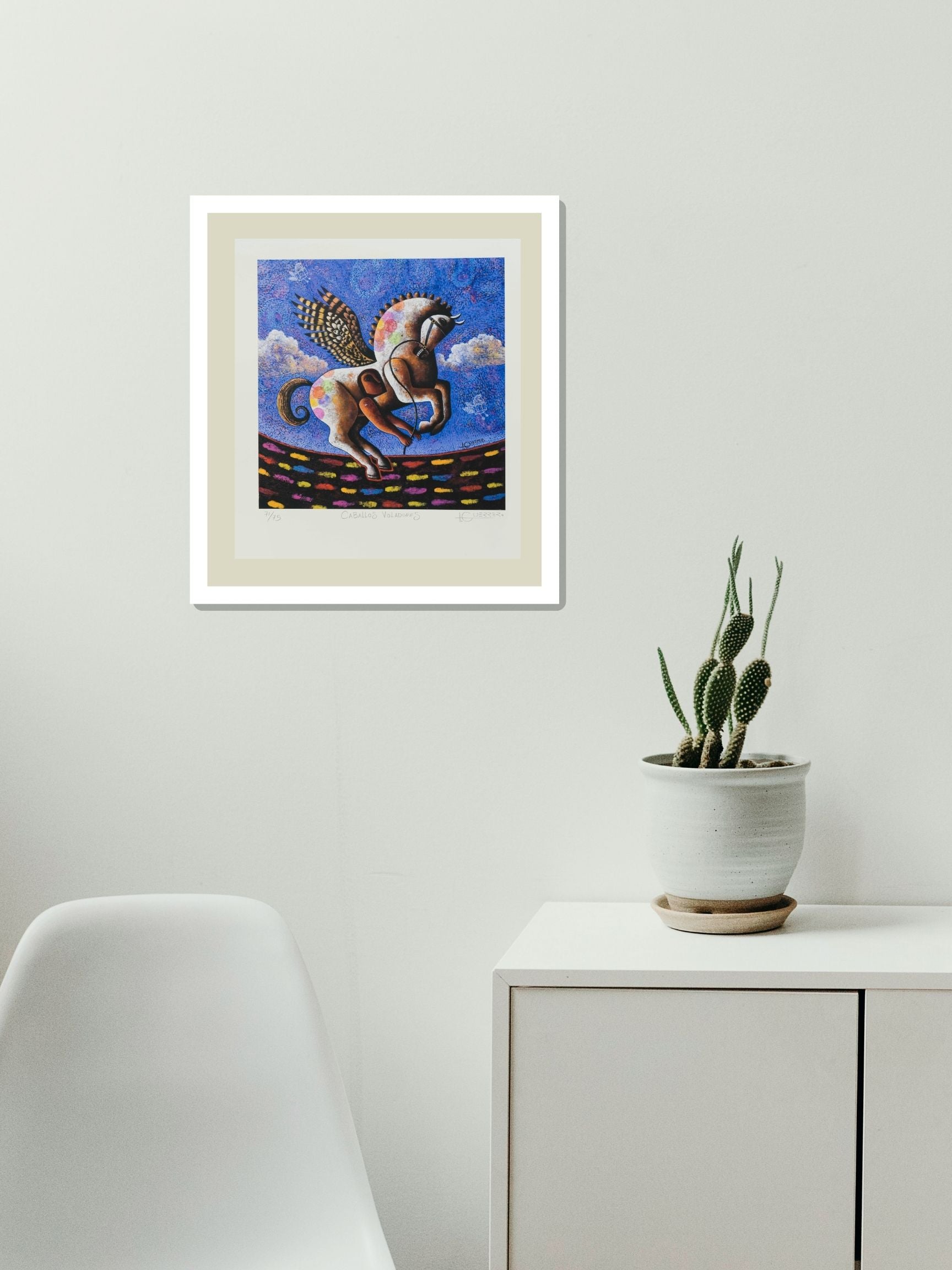 Esta obra única de Ignacio Guerrero titulada "Caballos Voladores" ha sido creada utilizando la técnica de Piezografía. Sus dimensiones son 24x24 cm.