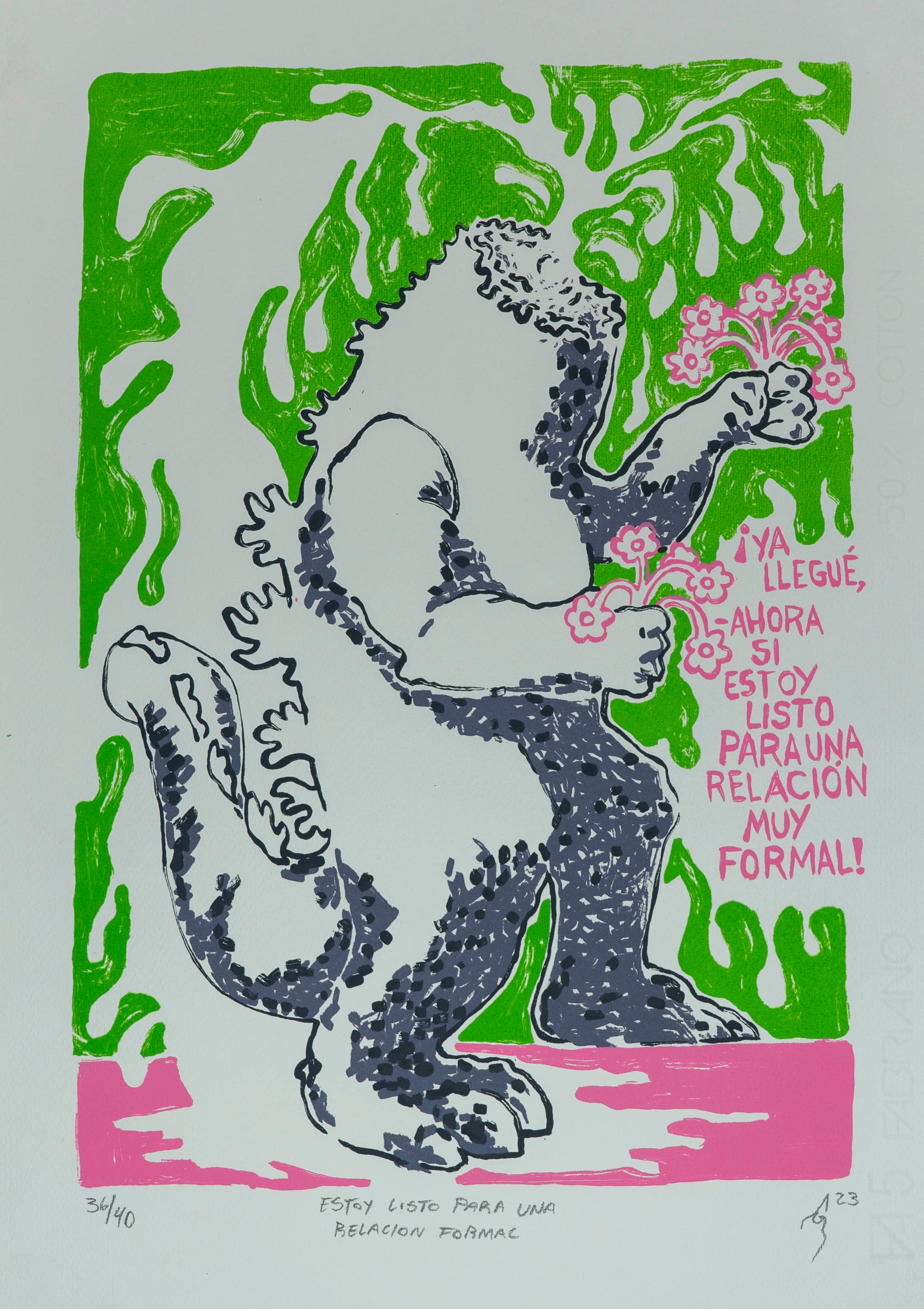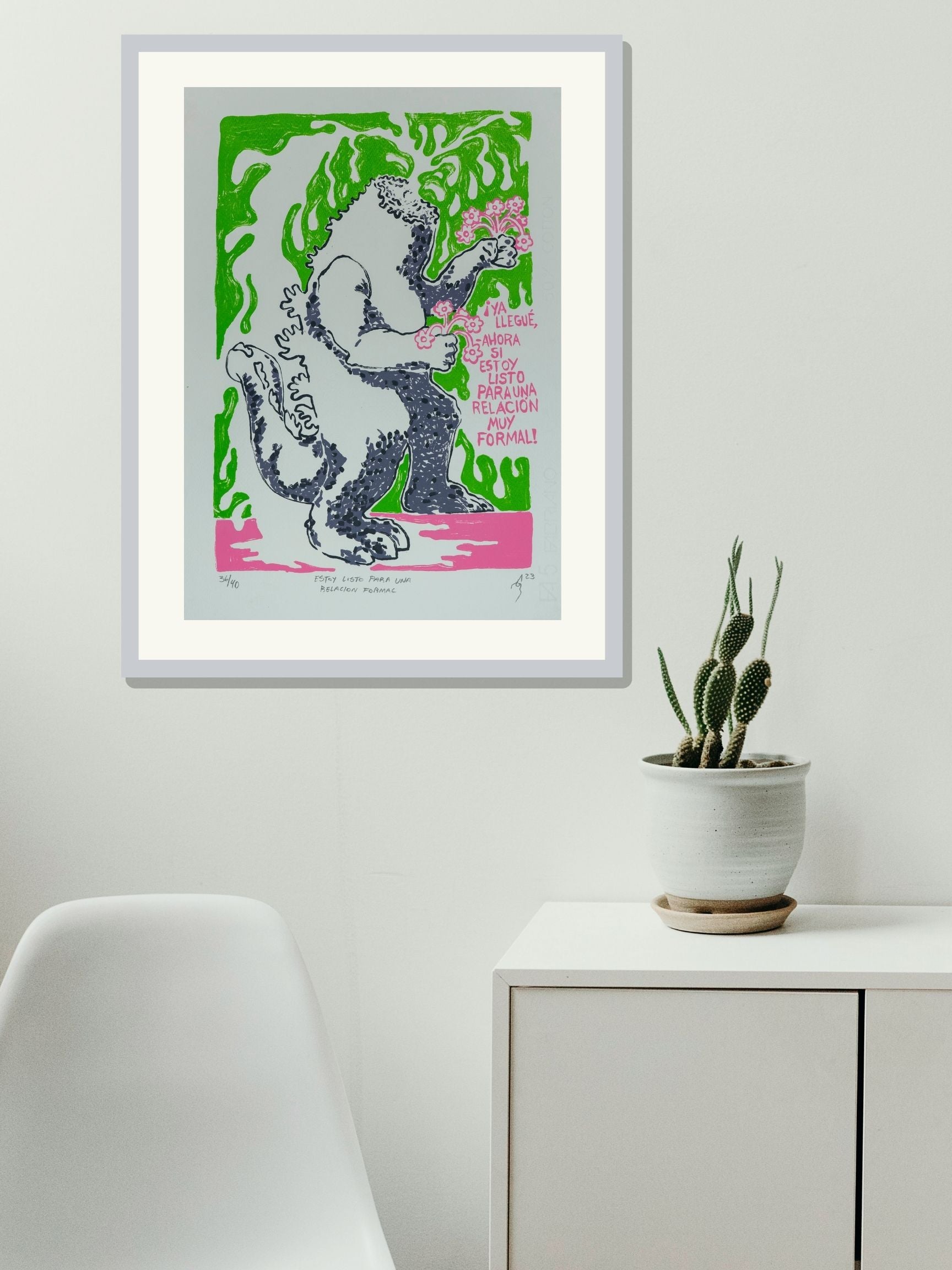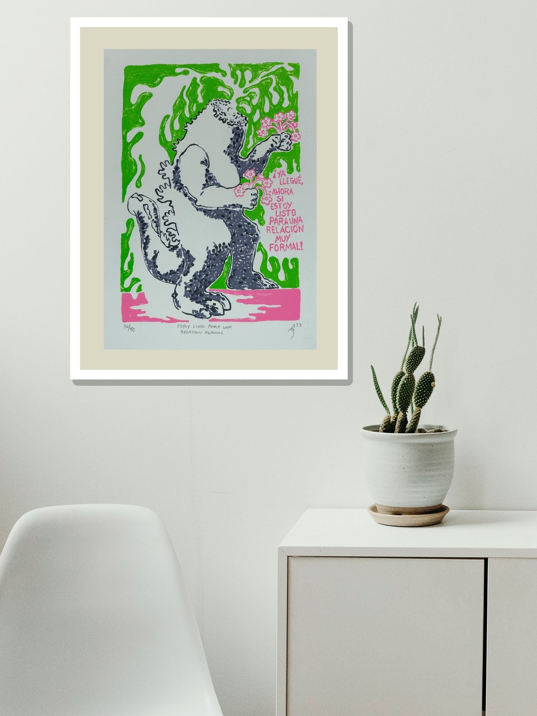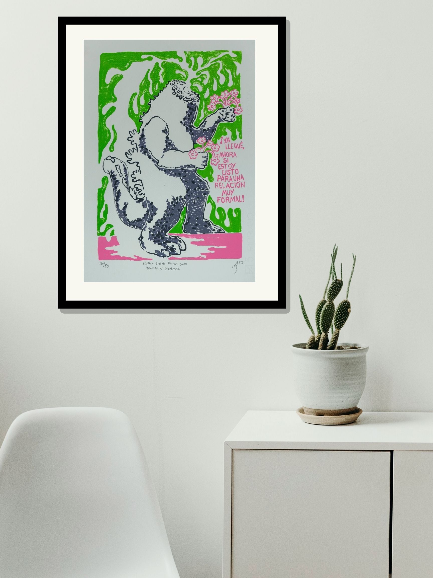 Esta obra única de AMG titulada "Estoy listo para una relacion formal" ha sido creada utilizando la técnica de Serigrafía. Sus dimensiones son 50x35 cm.