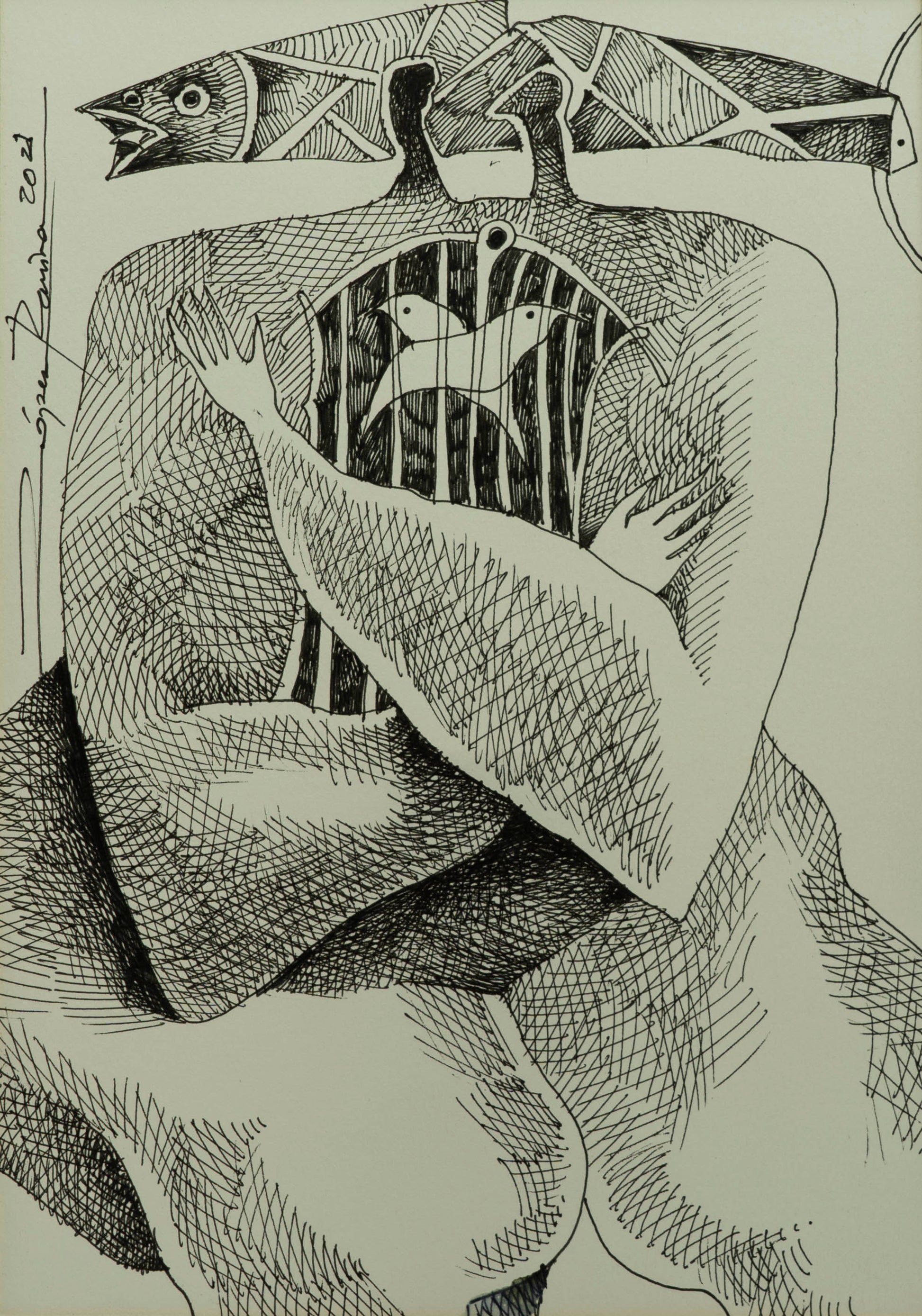 Esta obra única de Roberto Lopez Ramirez titulada "Jaula Interna" ha sido creada utilizando la técnica de Tinta China sobre papel. Sus dimensiones son 20x14 cm.