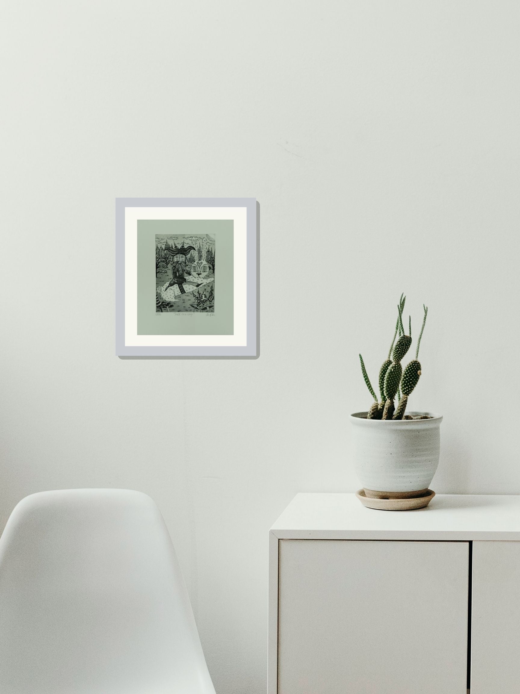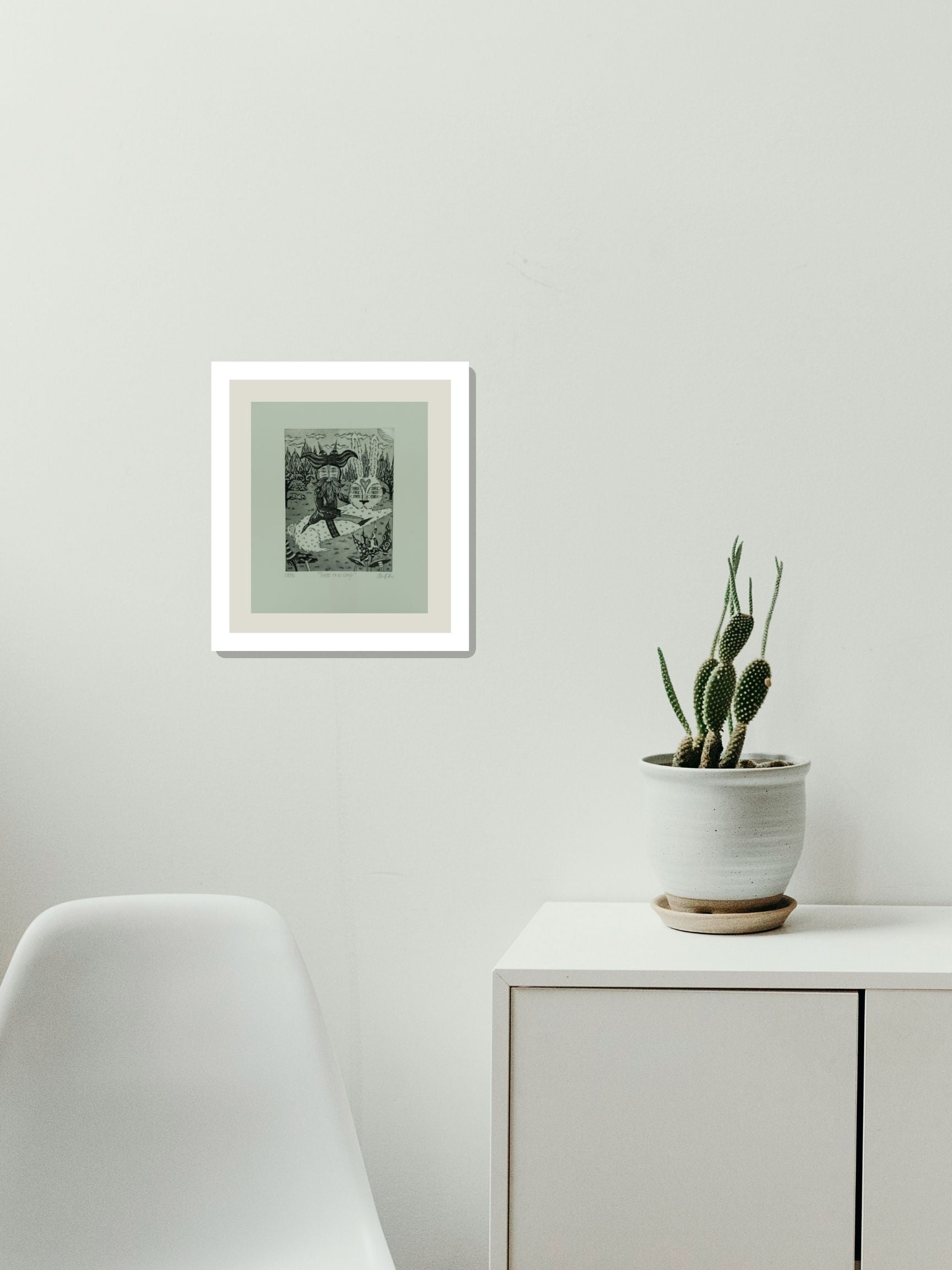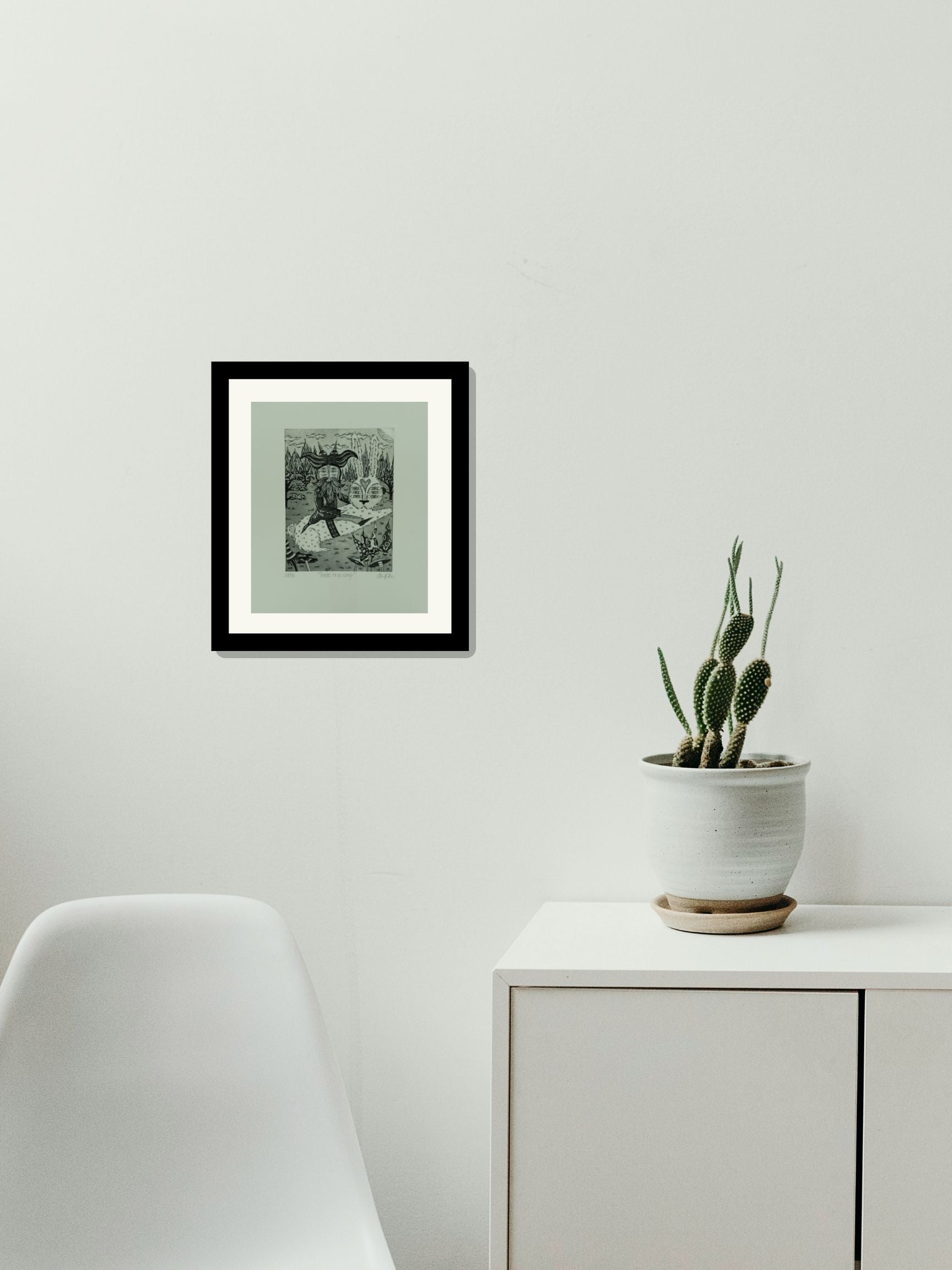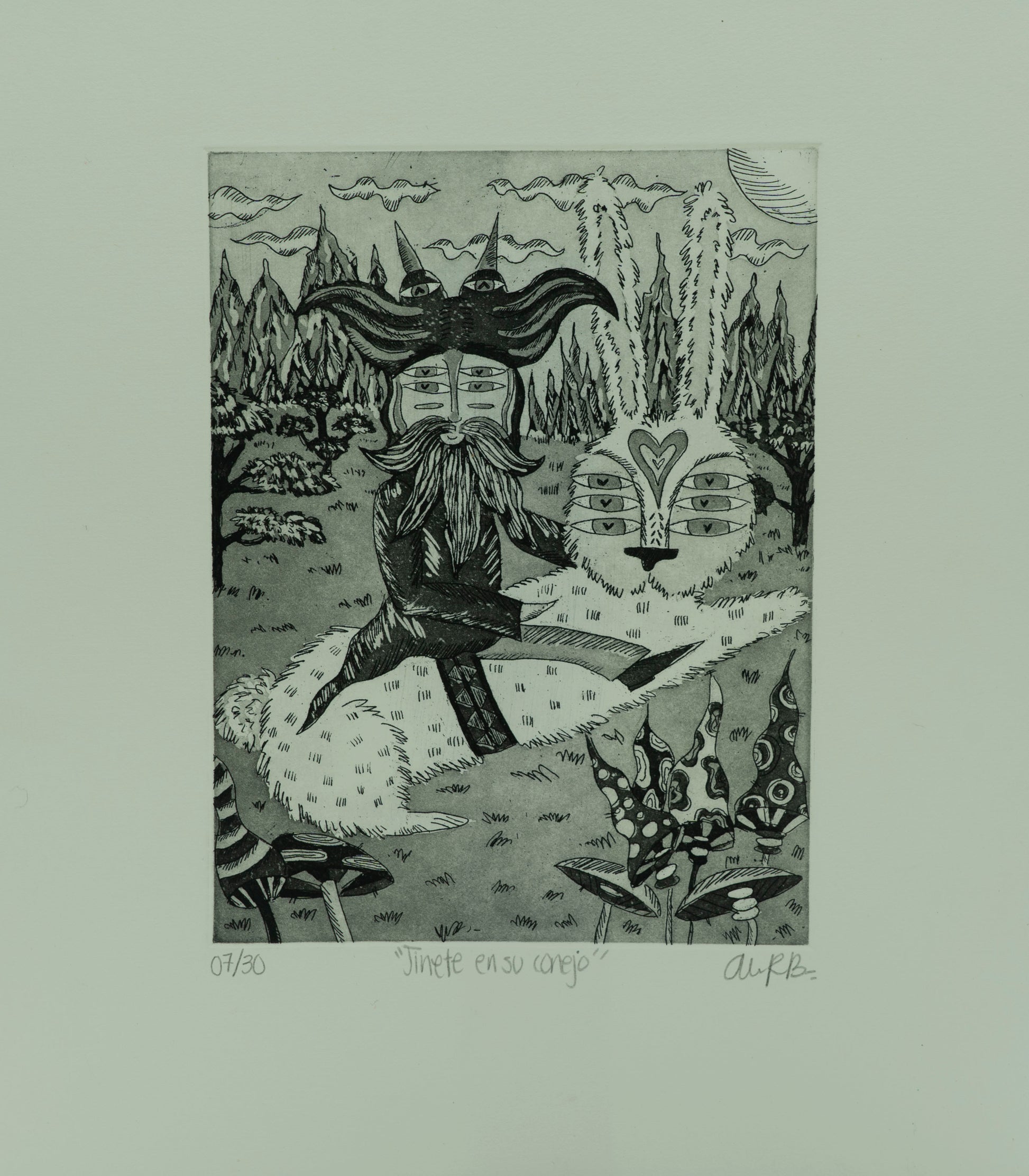 Esta obra única de Ale RB titulada "Jinete en su conejo" ha sido creada utilizando la técnica de Grabado. Sus dimensiones son 19x15 cm.