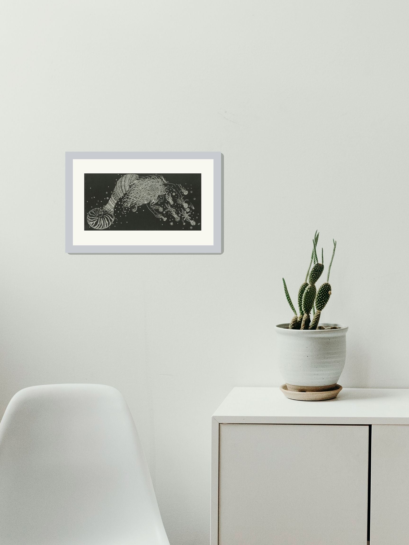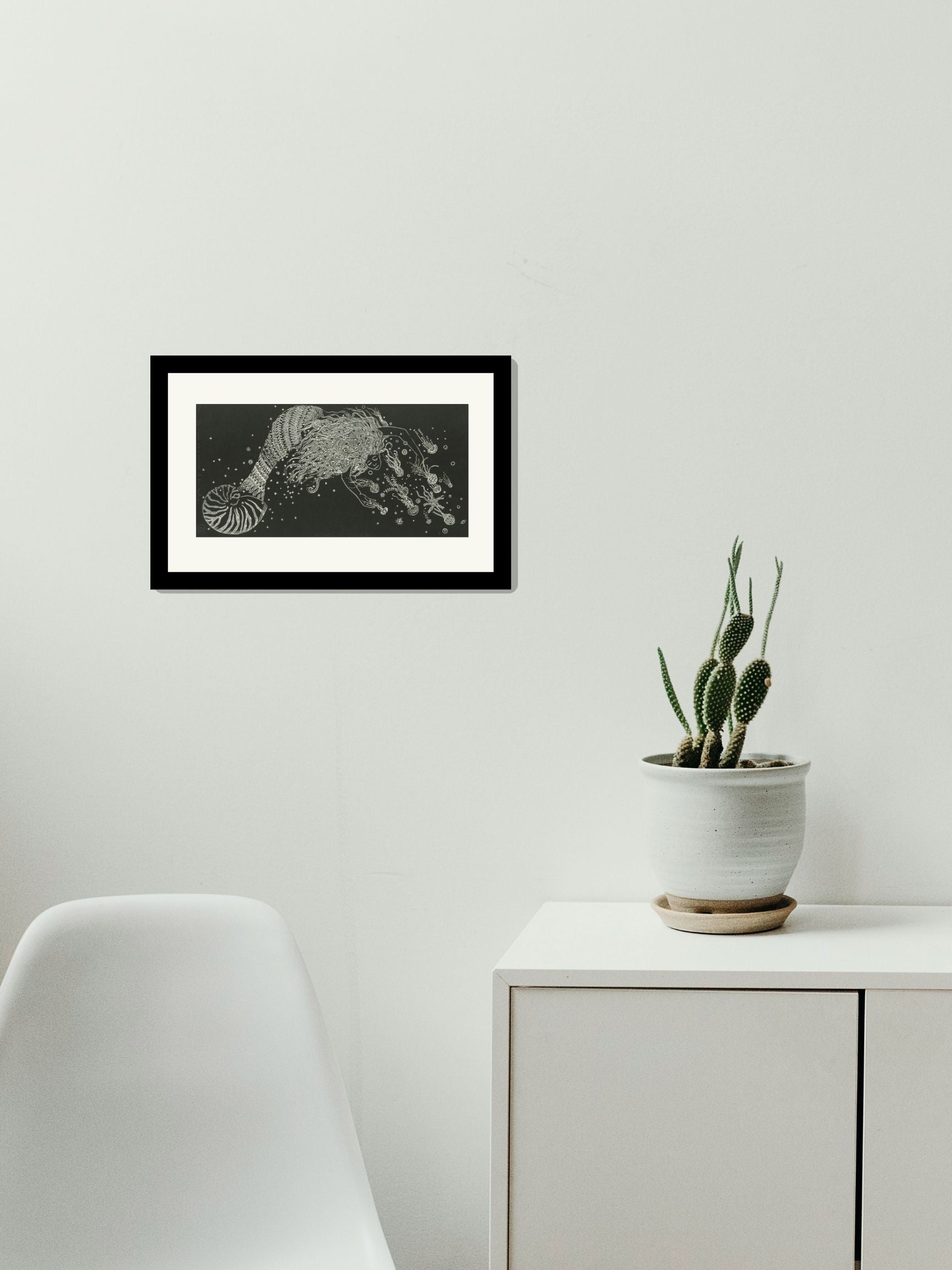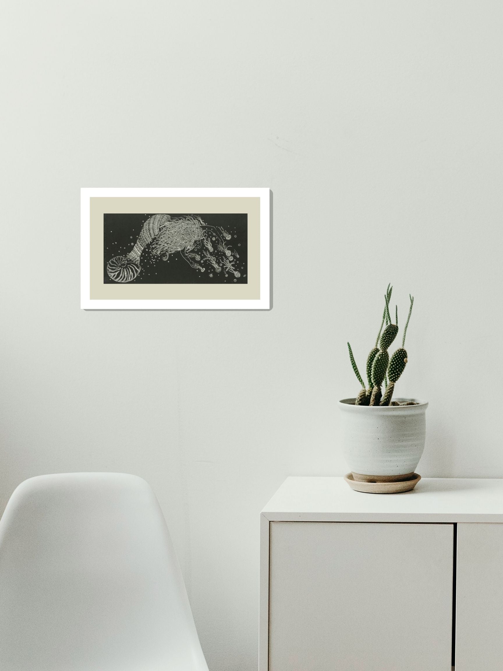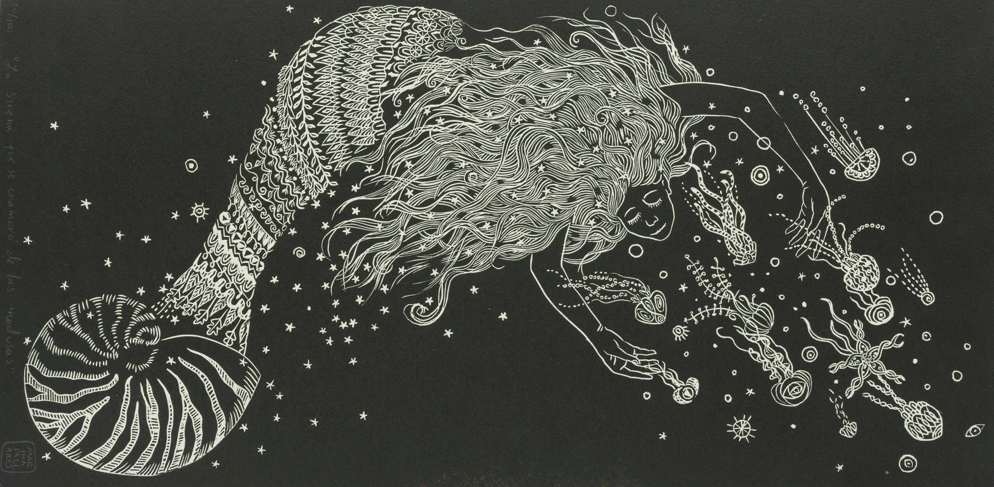 Esta obra única de Marina Pallares titulada "La sirena que se enamora de las medusas" ha sido creada utilizando la técnica de Grabado. Sus dimensiones son 39x19.5 cm.