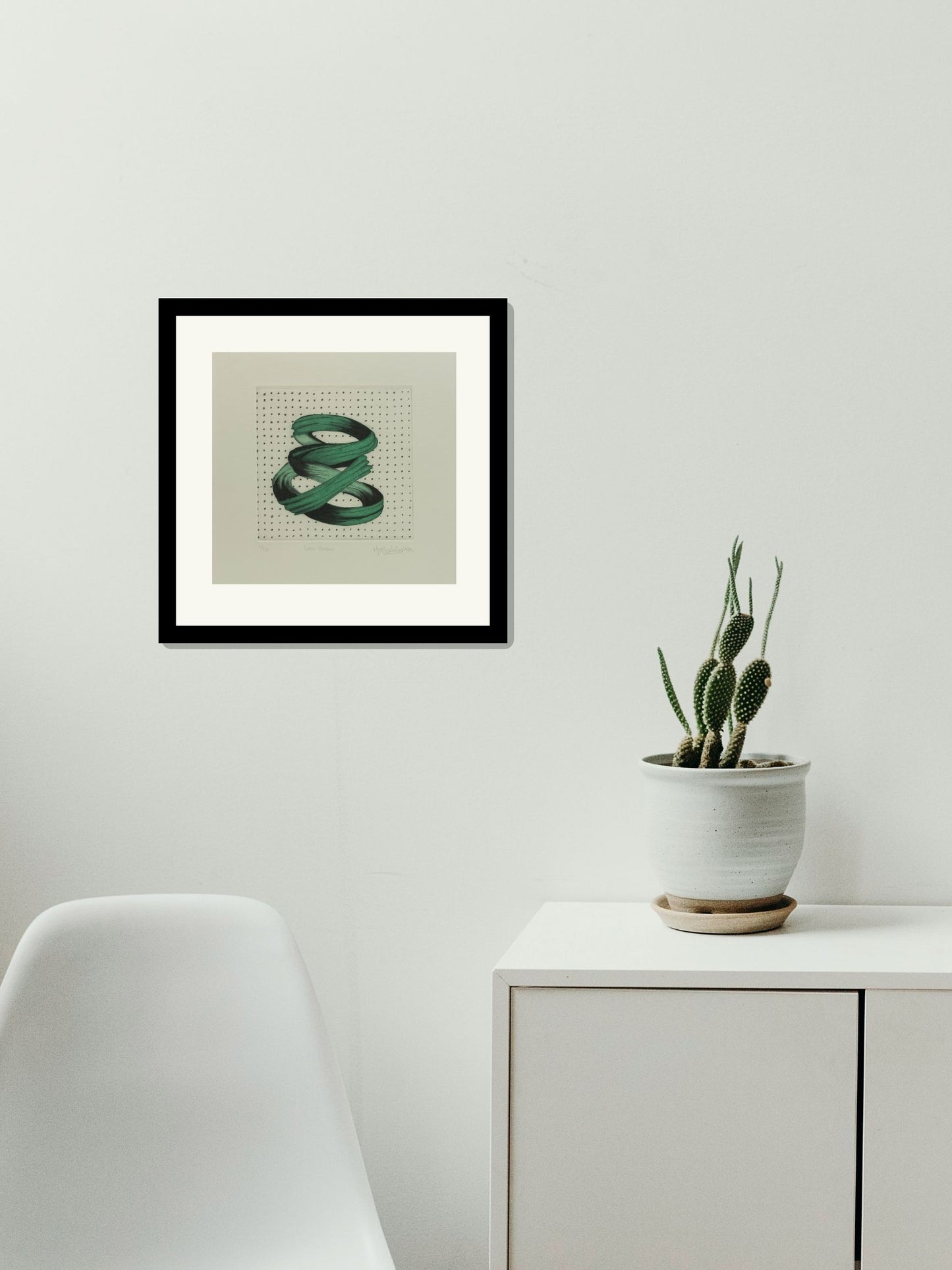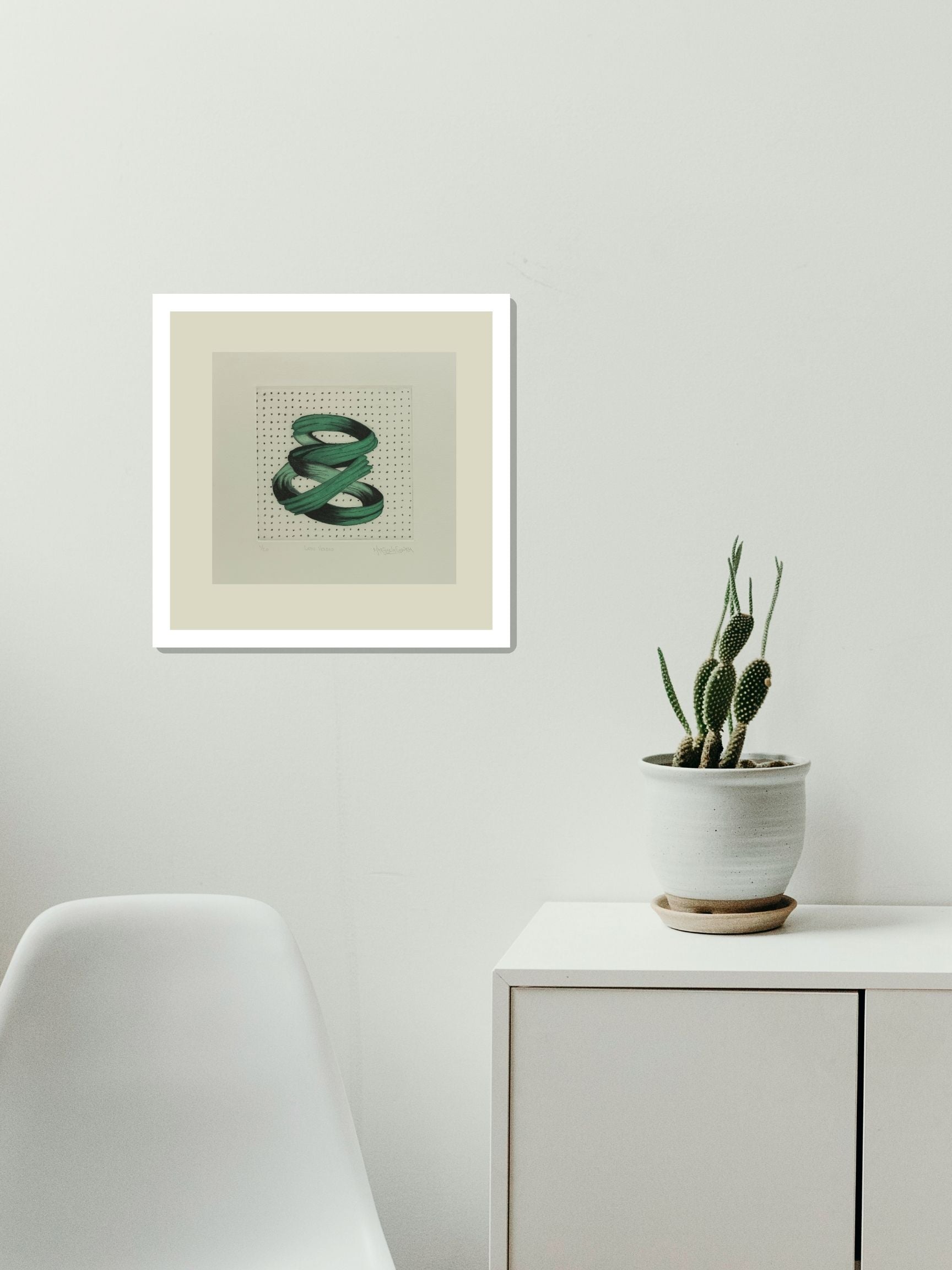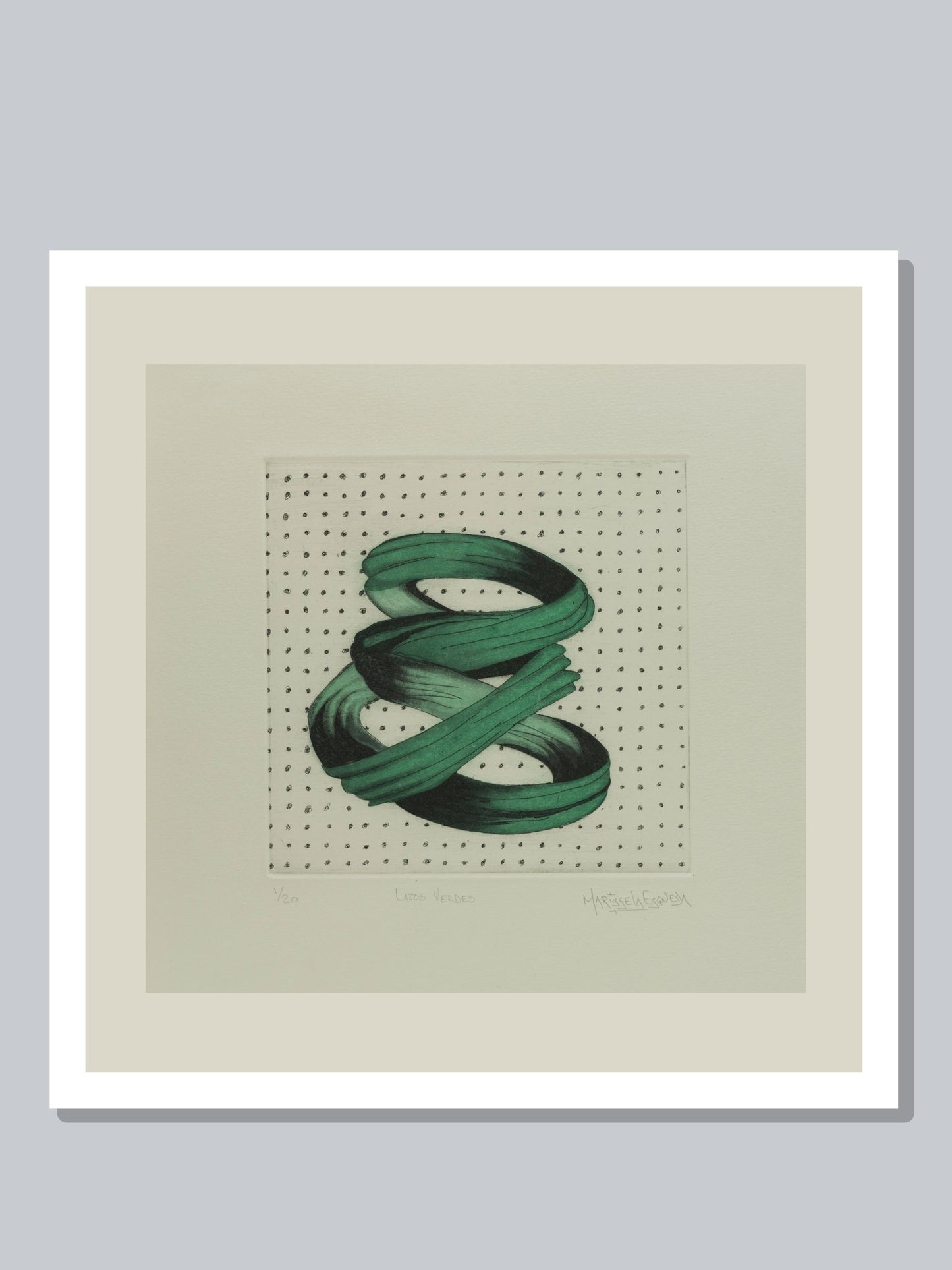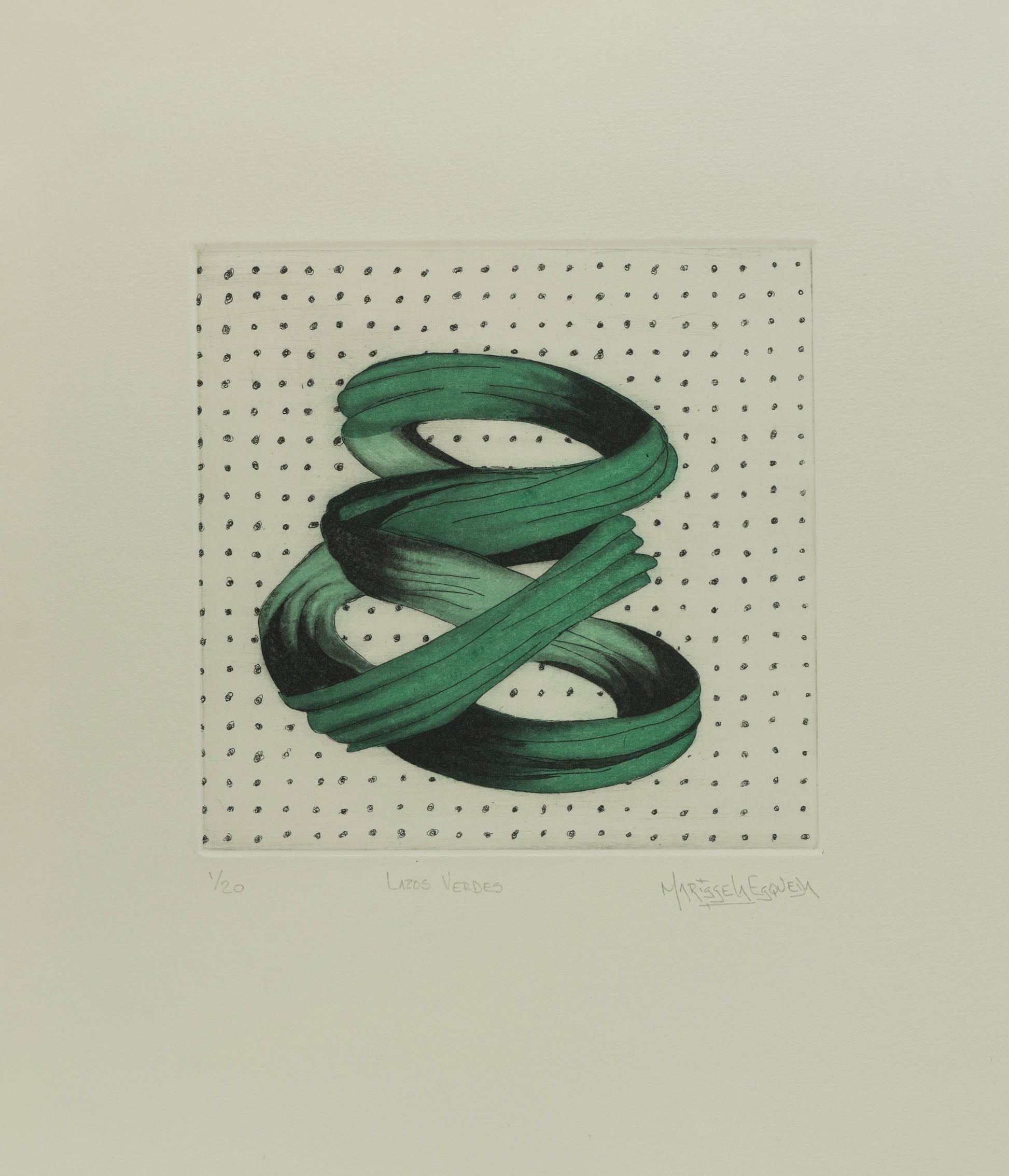 Esta obra única de Marissela Esqueda titulada "Lazos verdes" ha sido creada utilizando la técnica de Grabado. Sus dimensiones son 10.5x15 cm.