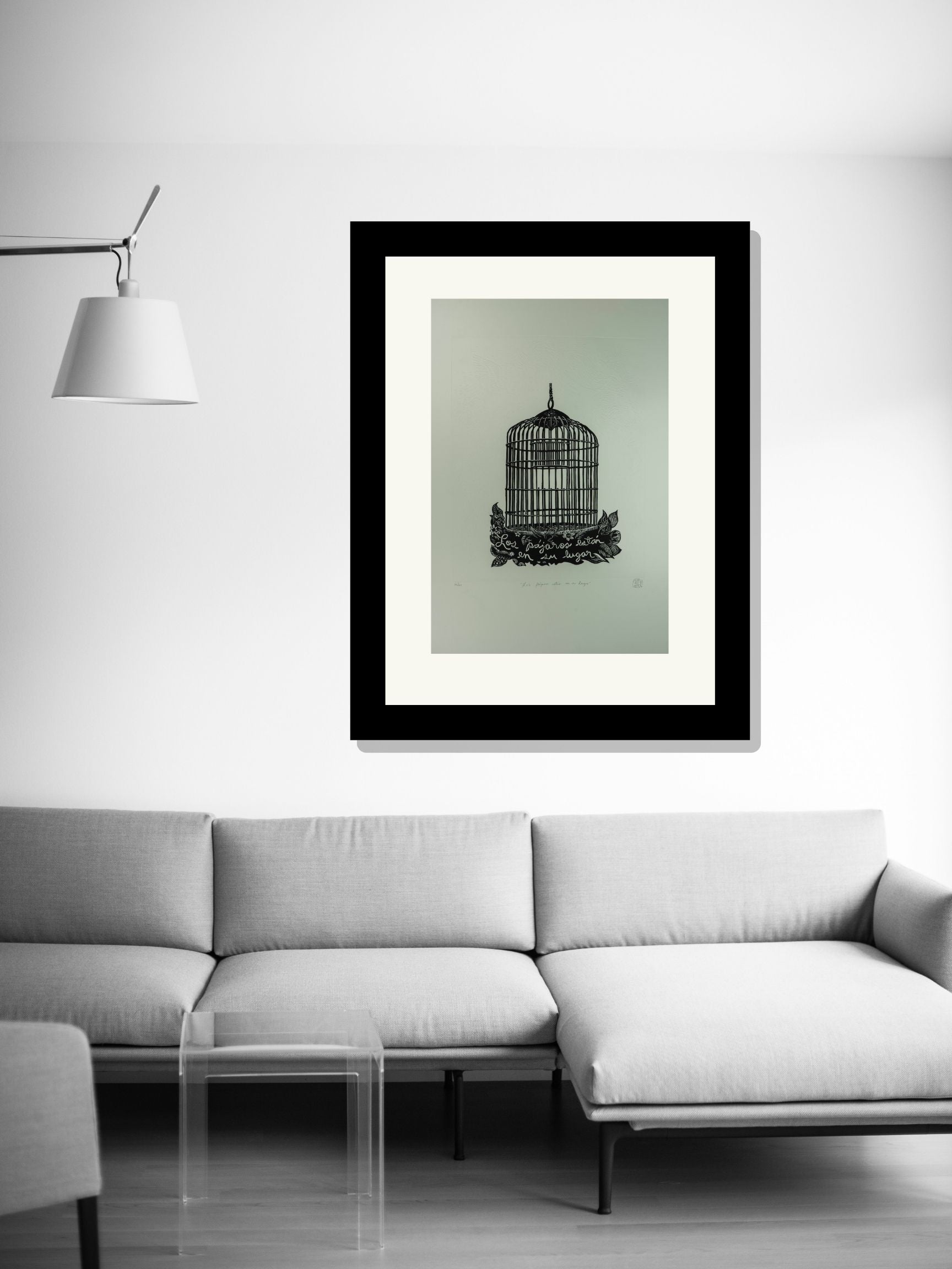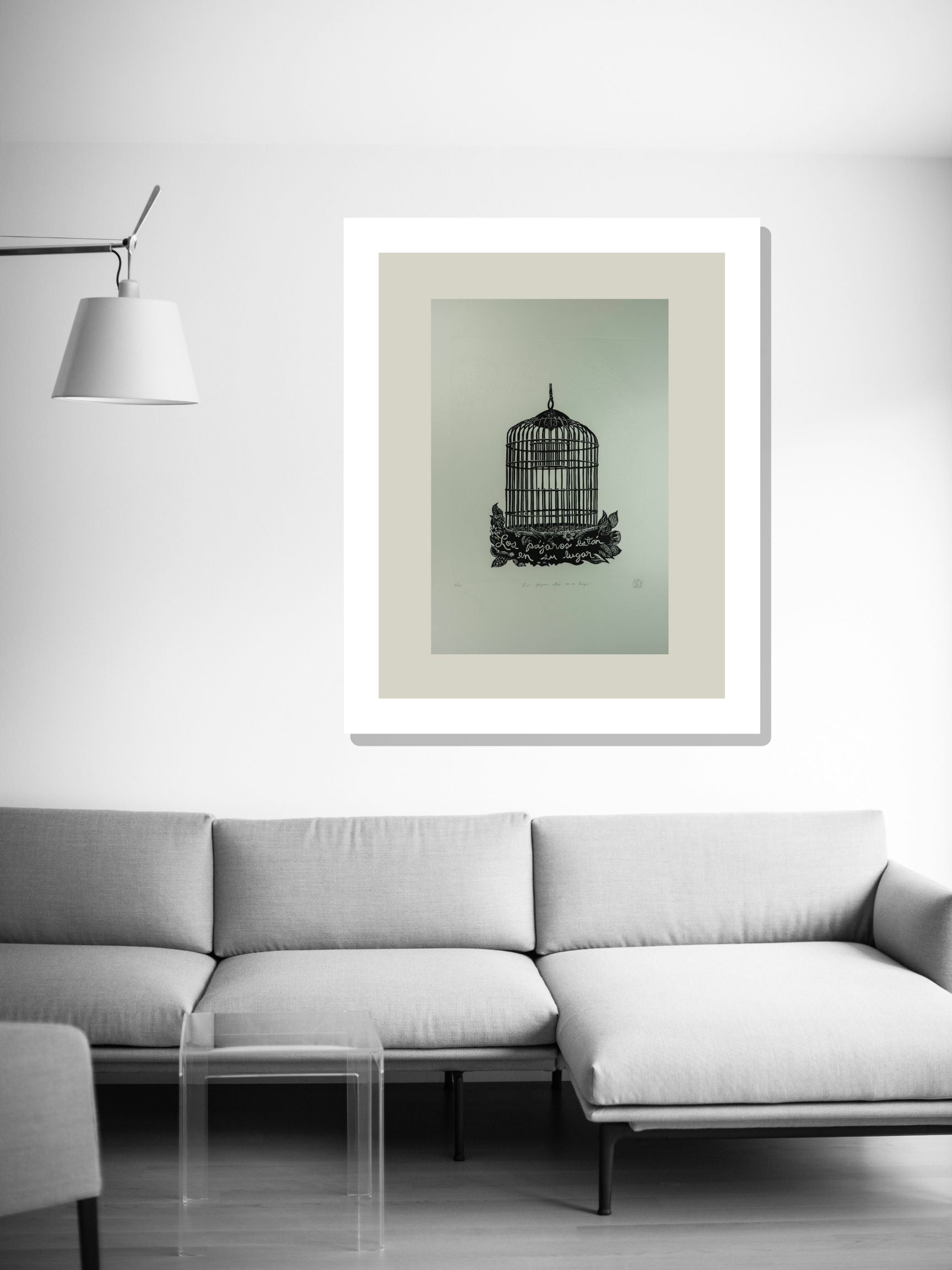 Esta obra única de Marina Pallares titulada "Los pájaros están en su lugar" ha sido creada utilizando la técnica de Grabado. Sus dimensiones son 50x40 cm.
