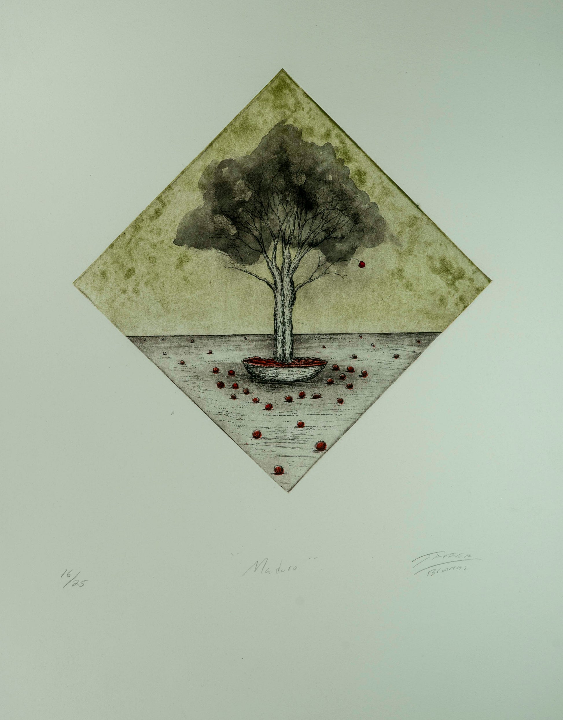 Esta obra única de Javier Blancas titulada "Maduro" ha sido creada utilizando la técnica de Grabado. Sus dimensiones son 36x36 cm.