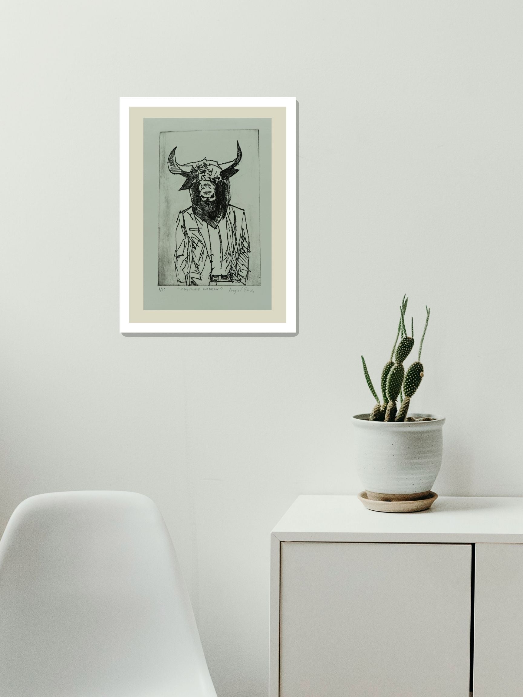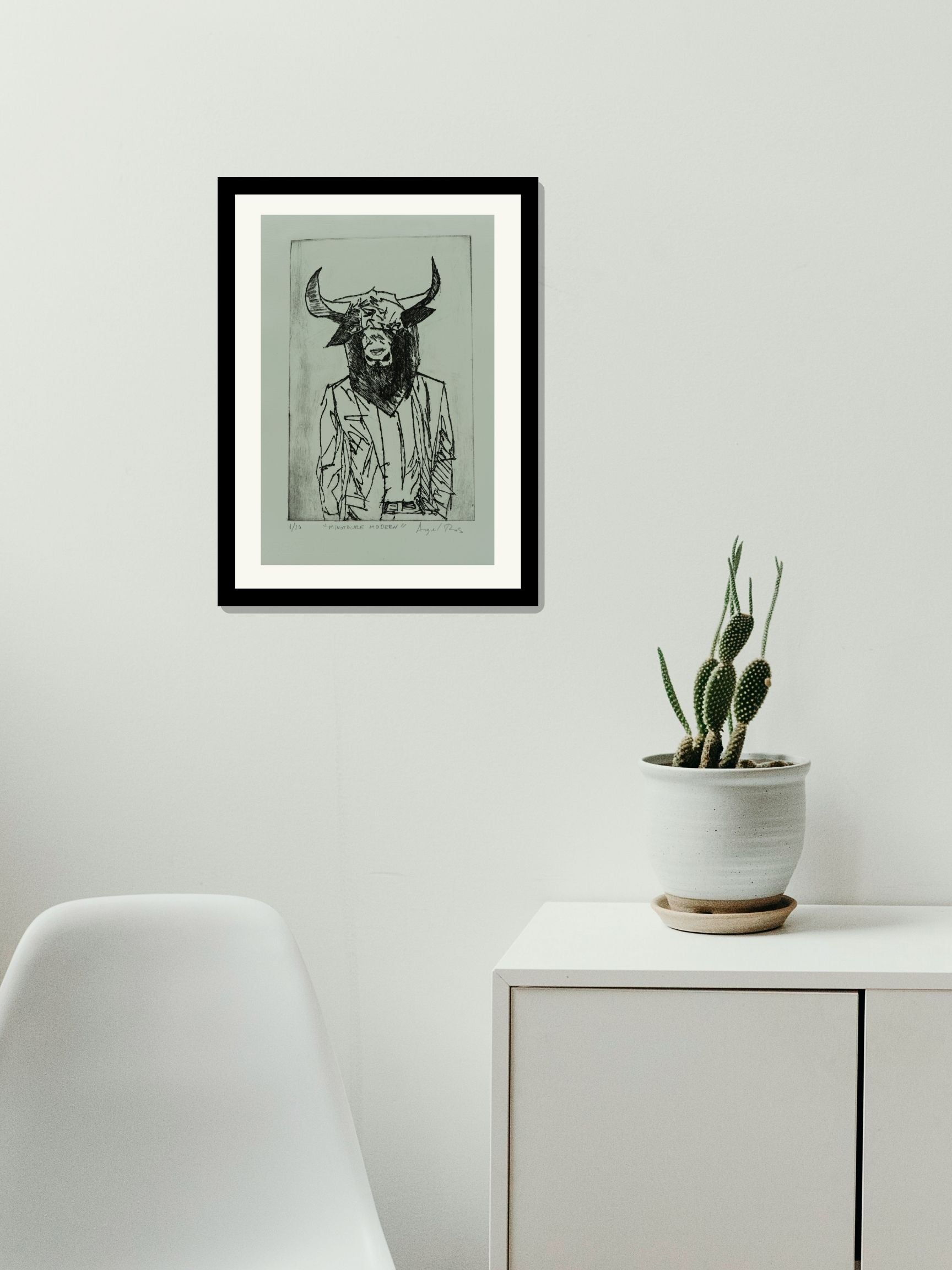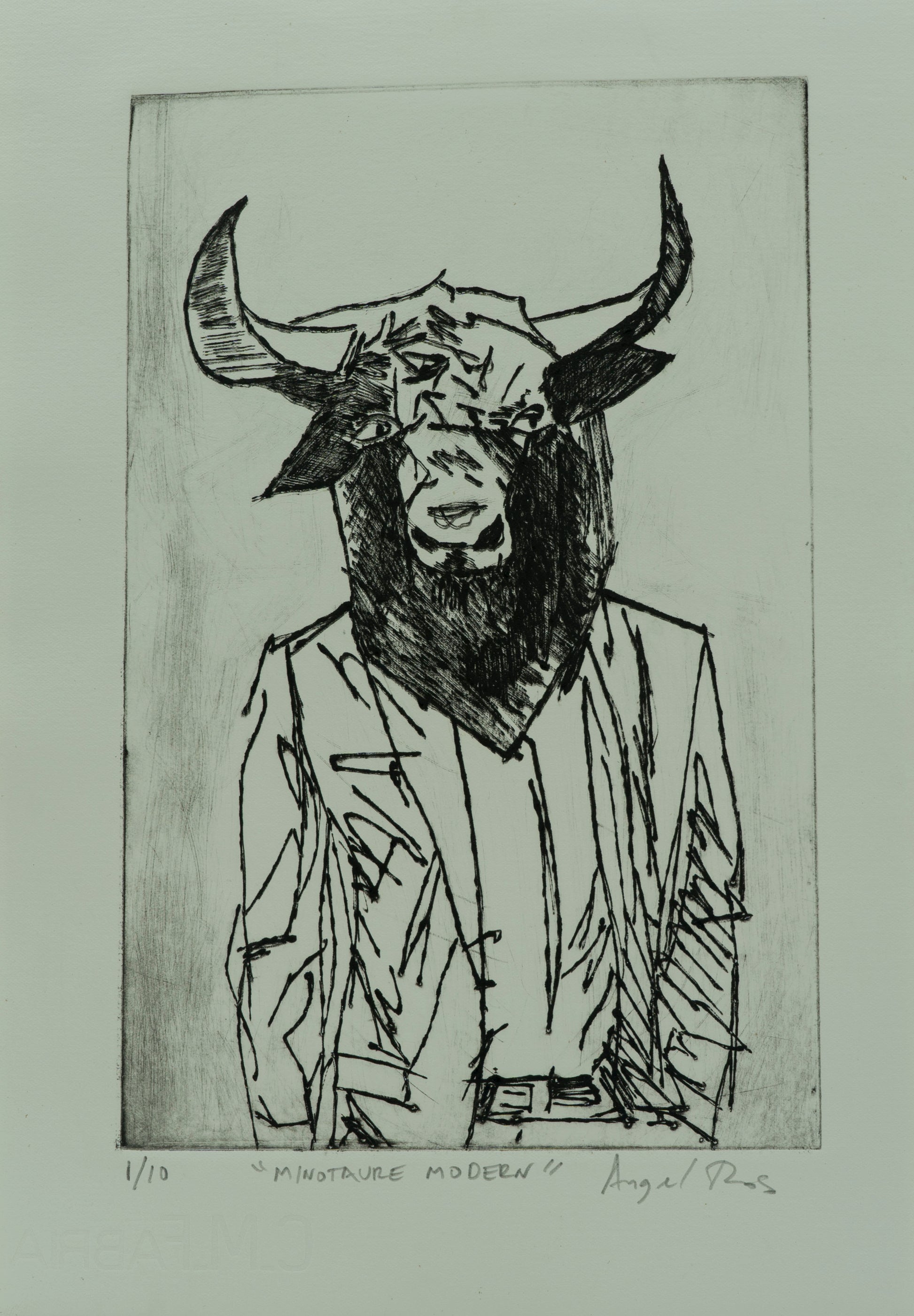 Esta obra única de Ángel Ros titulada "Minotaure modern" ha sido creada utilizando la técnica de Grabado. Sus dimensiones son 27x18 cm.