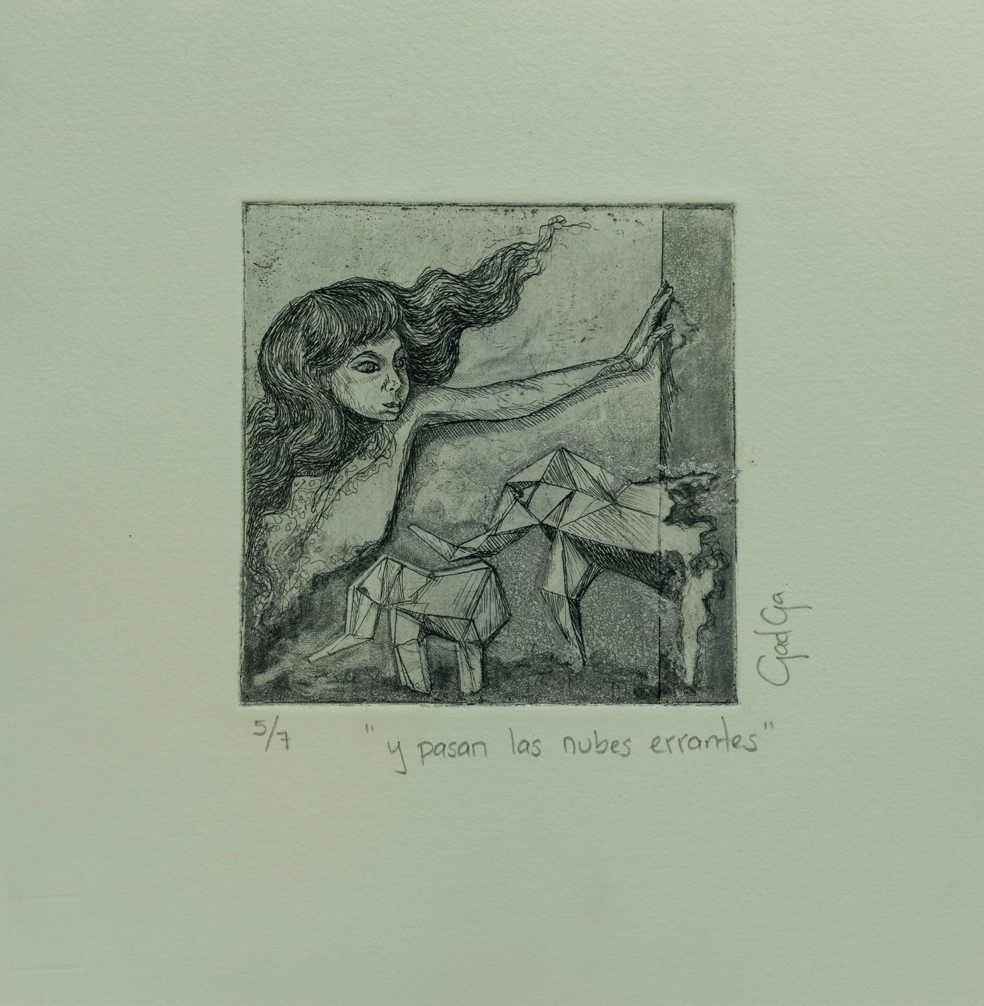 Esta obra única de Jessica Gadga titulada "Pasan las nubes errantes" ha sido creada utilizando la técnica de Grabado. Sus dimensiones son 10x10 cm.