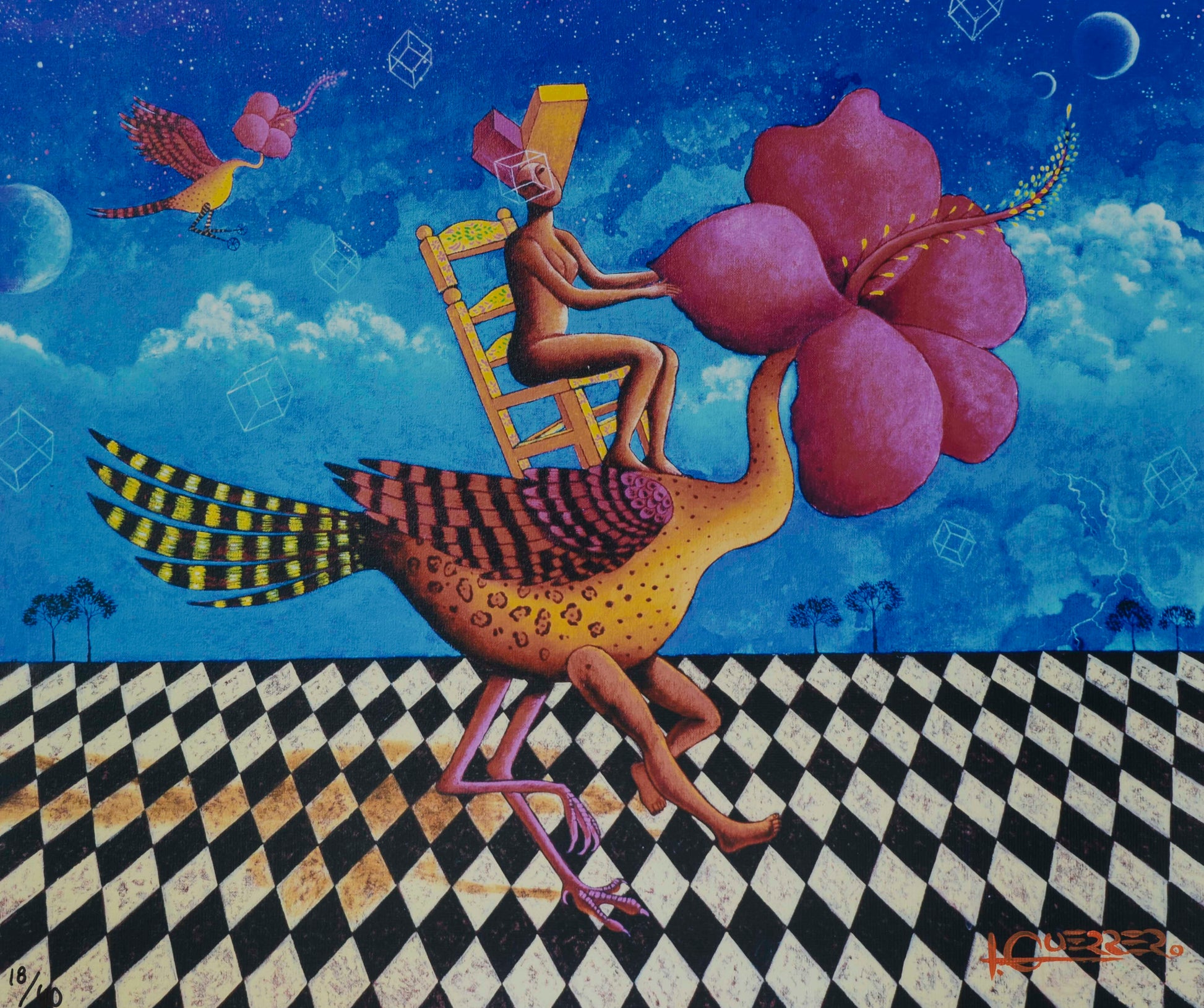Ignacio Guerrero es un artista plástico autodidacta cuya obra surrealista explora la libertad creativa a través de colores vibrantes y personajes fantásticos en constante transformación.