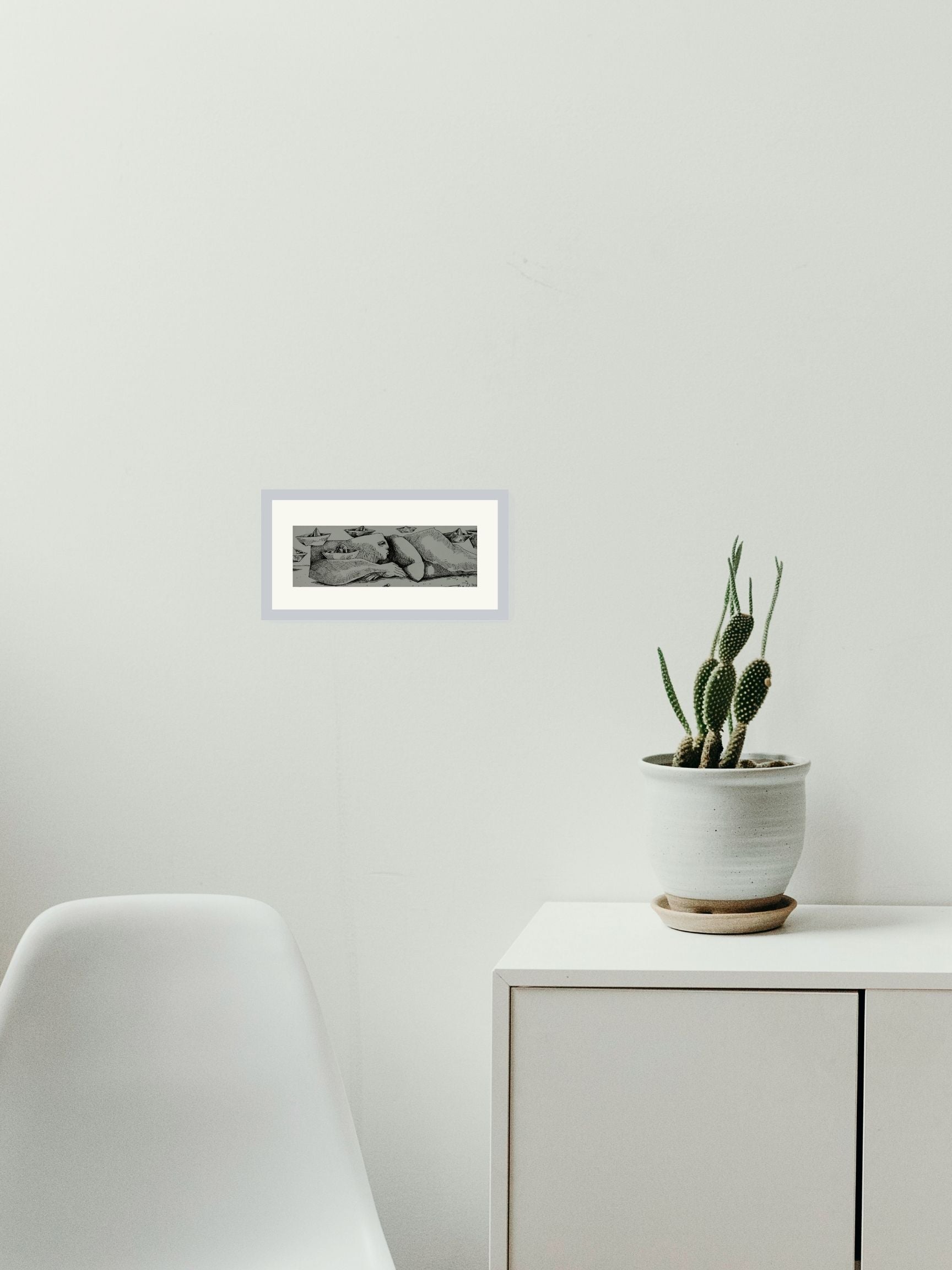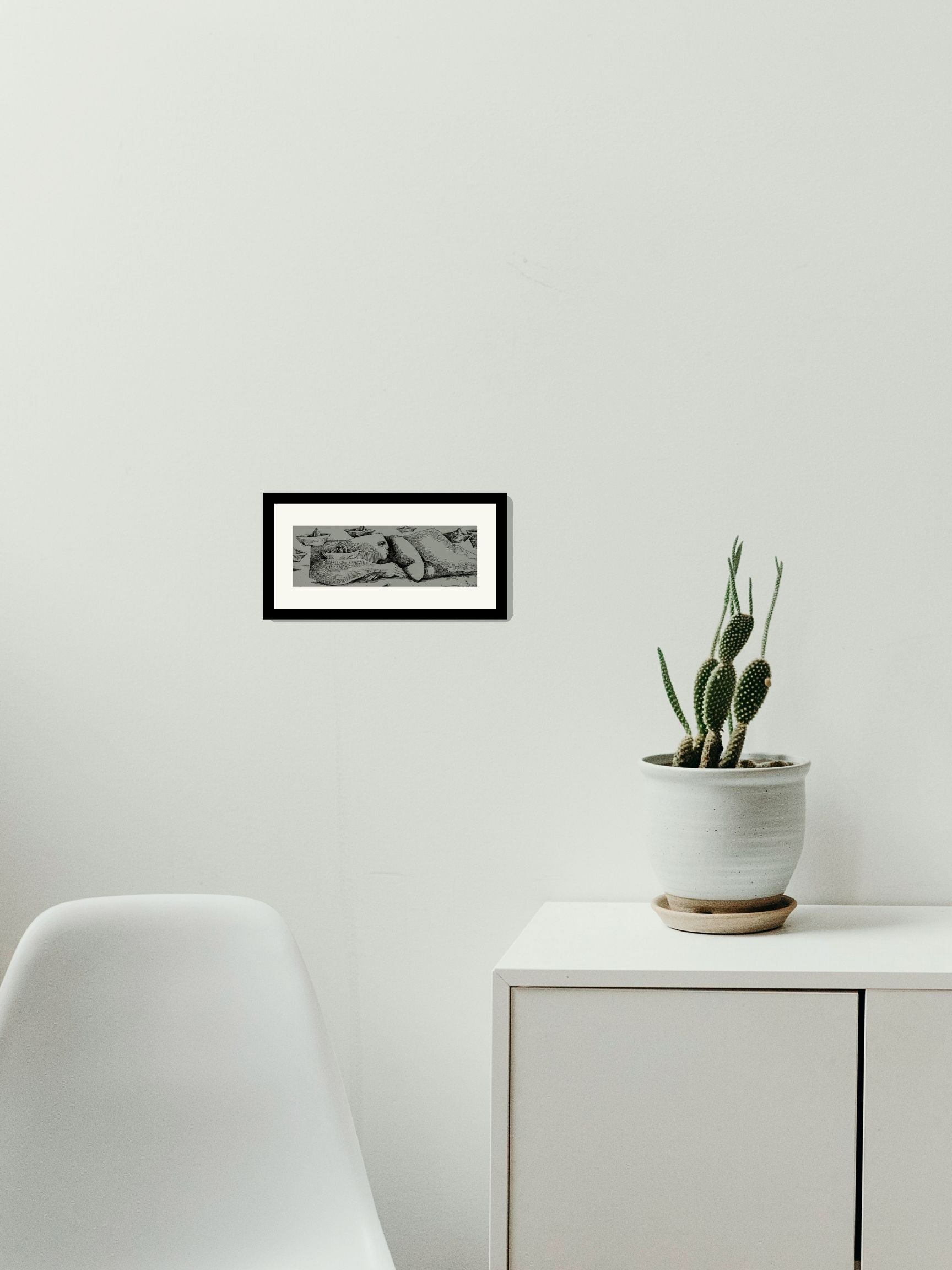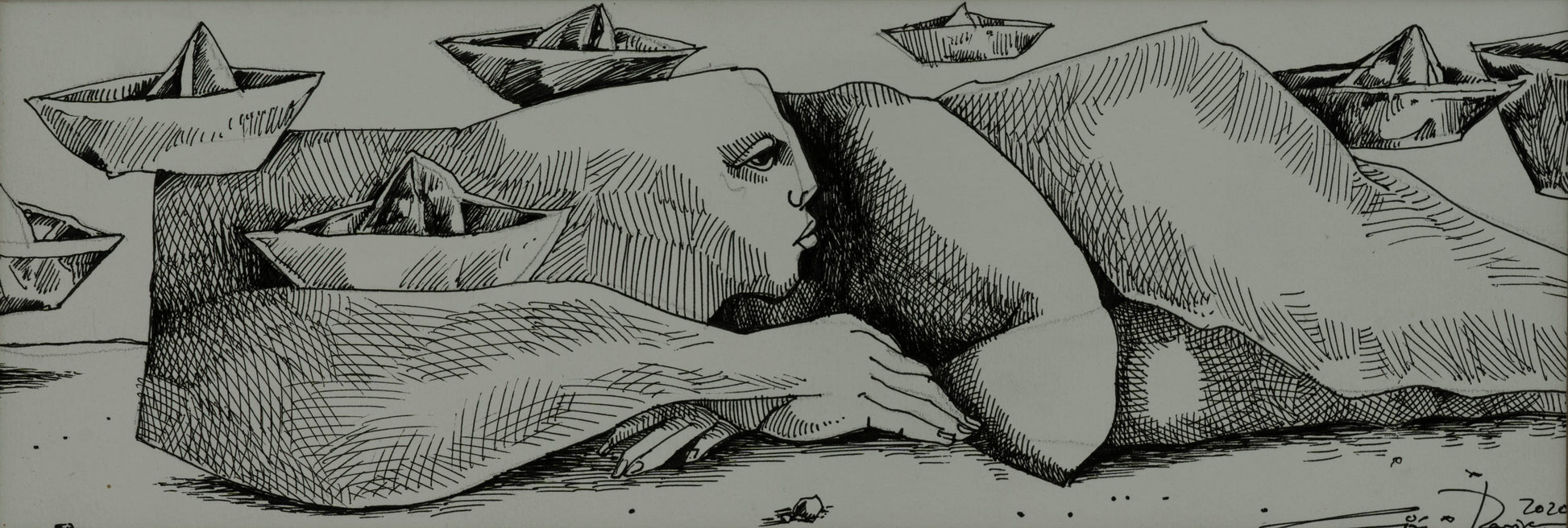 Esta obra única de Roberto Lopez Ramirez titulada "Soñando con barcos" ha sido creada utilizando la técnica de Tinta china sobre papel. Sus dimensiones son 10x28 cm.