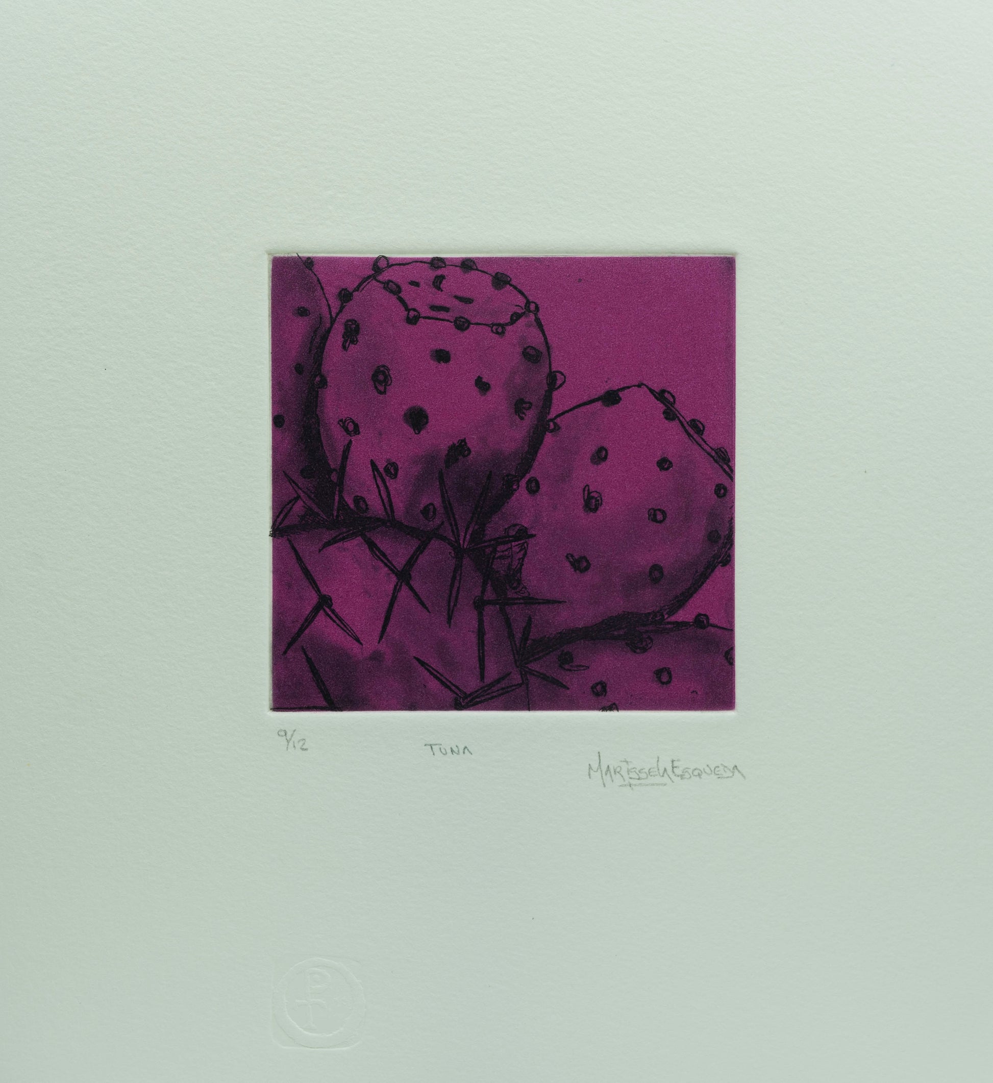 Esta obra única de Marissela Esqueda titulada "Tuna" ha sido creada utilizando la técnica de Grabado. Sus dimensiones son 9x10 cm.